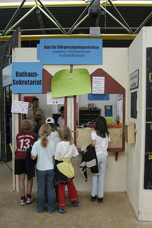 BürgerbüroDas Bürgerbüro stellt wichtige Ausweise aus. So gut wie alle Mini-Münchner streben den sogenannten "Vollbürgerausweis" an. Voraussetzung sind unter anderem vier Stunden Arbeit, vier Stunden Studium und die bestandene Vollbürgerprüfung. Vollbürger dürfen an Wahlen teilnehmen, sich mit einem Geschäft selbstständig machen, Grundstücke erwerben, den Führerschein machen und einige Spezialberufe ergreifen. |